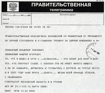 Видимая сторона скандала, разразившегося в Кемерово во время ответного полуфинального матча между "Кузбассом" и "Зорким", потихоньку идет на убыль: Федерация хоккея с мячом России вынесла свой вердикт, команды вовсю готовятся к предстоящим поединкам, горячие фанатские споры затихают... Но замять произошедшее не удалось. Факты вопиющего нарушения хоккейных правил и просто честной спортивной борьбы вызвали отклик на самых высоких уровнях. Вслед за реакцией вице-президента ФХМР Бориса Жиганова, заявившего о сложении своих полномочий в связи с возмутительным судейским произволом в Кемерово, свое мнение высказал и Губернатор Московской области Борис Всеволодович Громов, направивший в адрес клуба телеграмму: